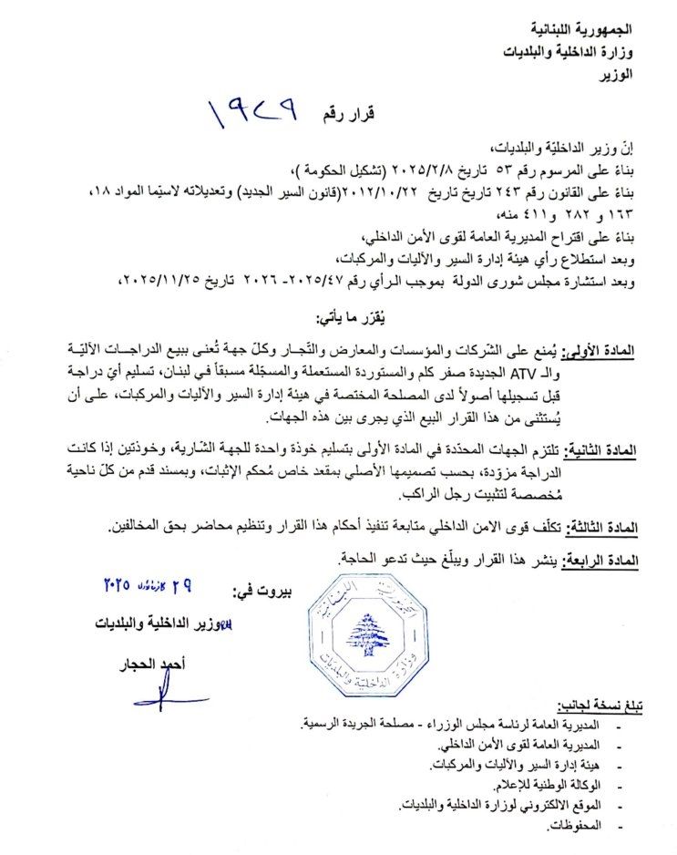 أصدر وزير الداخلية والبلديات أحمد الحجار قرارًا بشأن منع شركات ومؤسسات ومعارض وتجار وكلّ جهة تُعنى ببيع الدراجات الآلية و/أو الـATV الجديدة منها و/أو المستوردة المستعملة في لبنان، تسليم أي دراجة قبل تسجيلها أصولًا لدى المصلحة المختصة في هيئة إدارة السير والآليات والمركبات وإلزامها بتسليم خوذة للجهة الشارية.