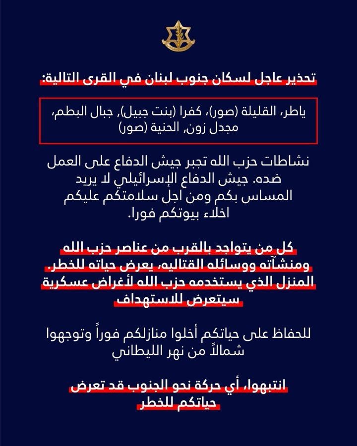 وجّه الجيش الاسرائيلي إنذارا عاجلًا لسكان القرى التالية بضرورة المغادرة: “ياطر- القليلة- (صور)- كفرا (بنت جبيل)- جبال البطم مجدل زون- الحنية (صور).