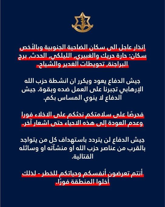 وجّه المتحدث باسم الجيش الإسرائيلي أفيخاي أدرعي إنذاراً عاجلاً الى سكان الضاحية الجنوبية، خصوصاً سكان أحياء: