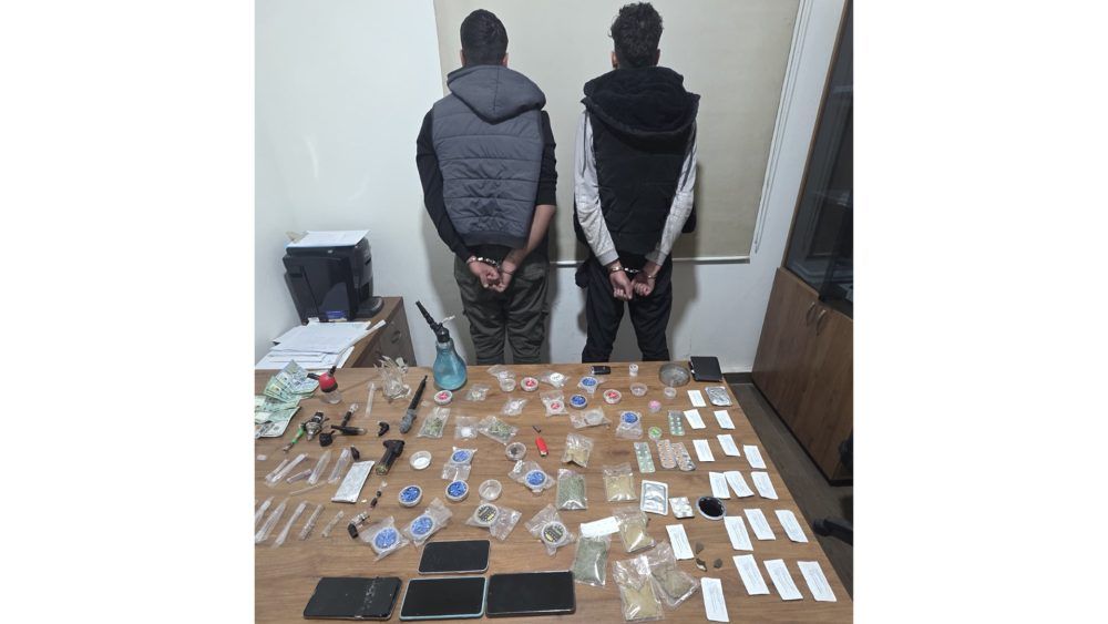 وخلال التفتيش، ضُبط بحوزتهما وعلى متن السيارة: 20 طبّة تحتوي مادة الكريستال، و7 طبّات تحتوي مادة الباز، و4 مظاريف تحوي مادة حشيشة الكيف، و4 مظاريف تحوي مادة الماريجوانا، إضافة إلى مظاريف أدوية وحبوب مختلفة الألوان، وأدوات تُستخدم لتعاطي المخدرات، إلى جانب 5 هواتف خلوية ومبلغ مالي.
