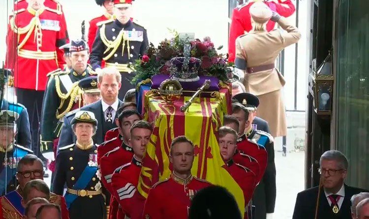 وقبل الساعة 11 صباحاً (1000 بتوقيت غرينتش) بقليل، ظهر النعش المصنوع من خشب البلوط والمغطى بالعلم الملكي وفوقه تاج الإمبراطورية على عربة مدفع تحت سماء ملبدة بالغيوم، ليتم نقله في موكب عسكري إلى كنيسة وستمنستر آبي.