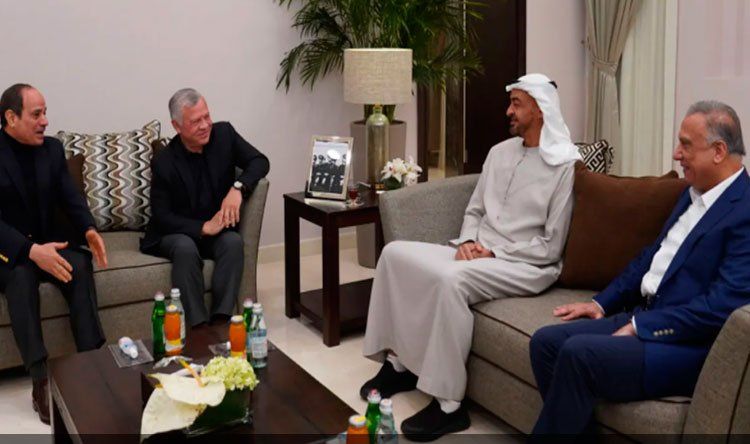 وقال الديوان الملكي في بيان، “استضاف الملك عبدالله الثاني، في العقبة اليوم الجمعة، الرئيس المصري عبد الفتاح السيسي، وسمو الشيخ محمد بن زايد آل نهيان، ولي عهد أبوظبي، نائب القائد الأعلى للقوات المسلحة في دولة الإمارات العربية المتحدة، ورئيس مجلس الوزراء العراقي مصطفى الكاظمي، في لقاء أخوي حضره الأمير الحسين بن عبدالله الثاني، ولي العهد، وسمو الأمير تركي بن محمد بن فهد بن عبدالعزيز، وزير الدولة عضو مجلس الوزراء في المملكة العربية السعودية، وسمو الشيخ حمدان بن محمد بن زايد آل نهيان، والشيخ محمد بن حمد بن طحنون آل نهيان، مستشار الشؤون الخاصة في وزارة شؤون الرئاسة في دولة الإمارات”.