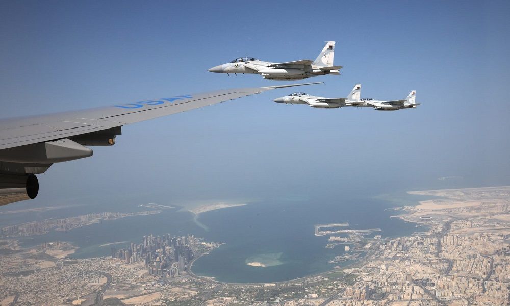 شاهد الرئيس الأميركي دونالد ترامب، من نافذة الطائرة الرئاسية الأميركية، مقاتلات “إف-15” القطرية التي رافقته قبيل الهبوط في مطار الدوحة.