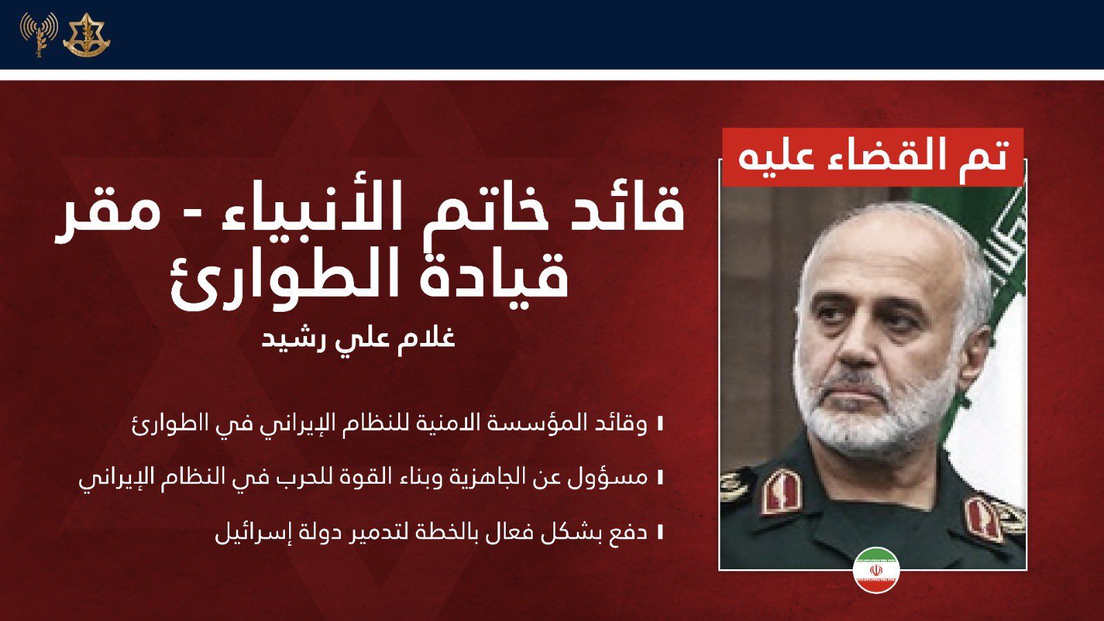 وأشار أدرعي إلى أنه “تم القضاء كذلك على قائد خاتم الانبياء غلام علي رشيد، الذي يرأس المؤسسة الامنية للنظام الايراني في اوقات الطوارئ”.