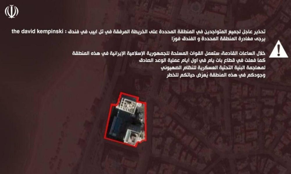 وجّهت إيران تحذيراً عاجلاً لجميع الموجودين في منطقة محددة في تل أبيب، شملت فندق The David Kempinski، أحد أبرز فنادق المدينة، ودعت إلى إخلائه فورًا.