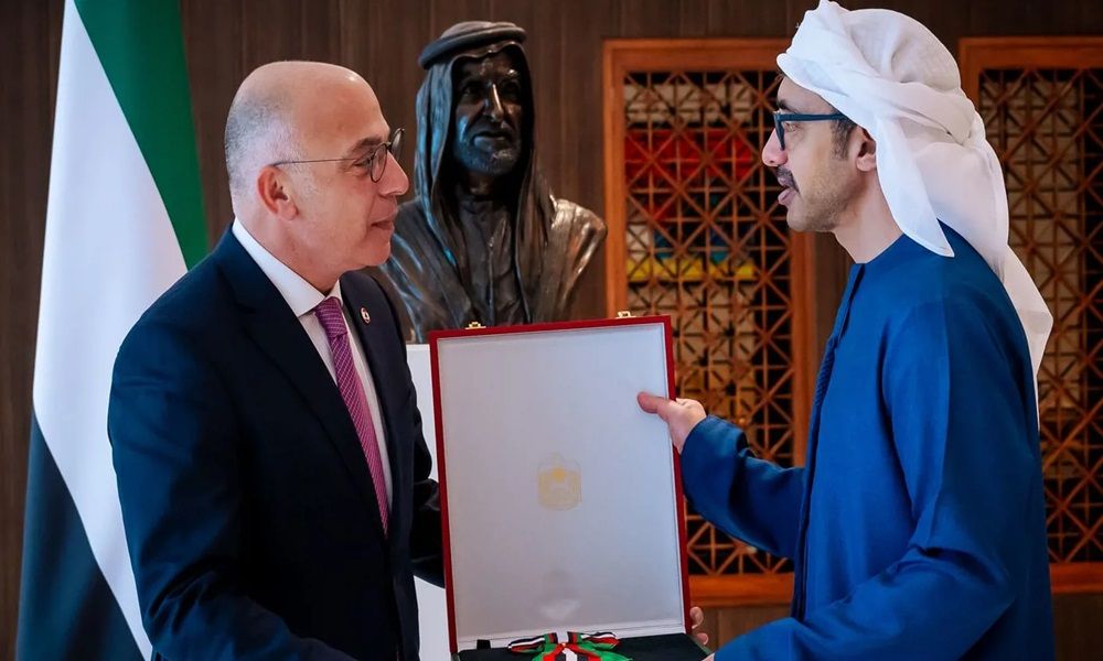 وقلد نائب رئيس مجلس الوزراء وزير الخارجية، السفير دندن الوسام، خلال استقباله له اليوم الأربعاء في أبوظبي.