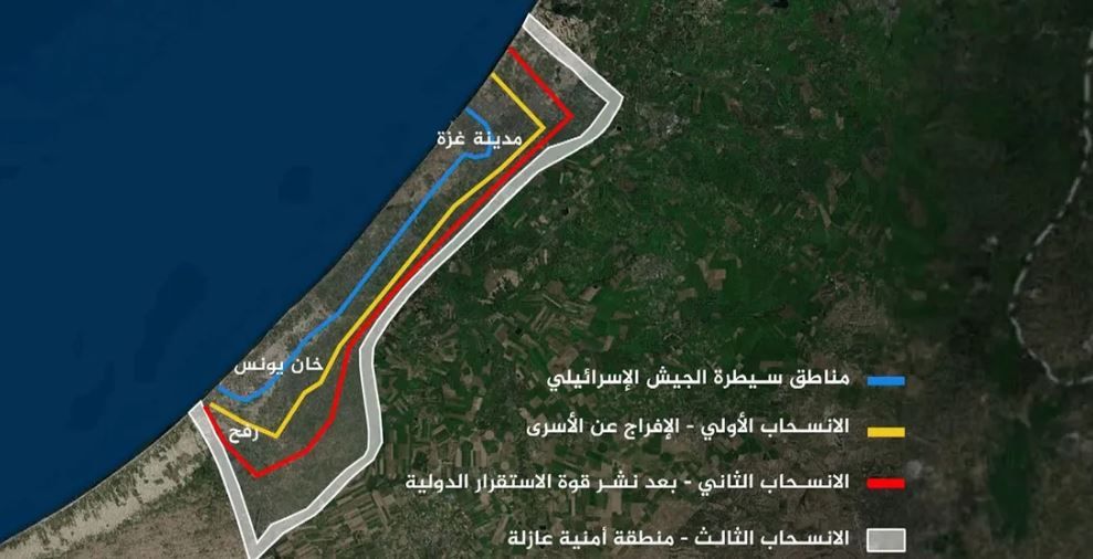 وبعد هذا الانسحاب الأولي لإتاحة إطلاق سراح الأسرى، ستنقل إسرائيل تدريجيًا السيطرة على أراضٍ إضافية إلى قوة دولية عربية-إسلامية سيتم إنشاؤها، وتضمن نزع السلاح من القطاع.