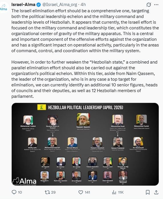 نشر معهد ألما الاسرائيلي للدراسات، صورة لقيادات حزب الله العسكرية وكتلته النيابية، مرفقاً إياها بجملة: “يجب أن تكون الجهود الإسرائيلية للقضاء على حزب الله شاملة، تستهدف كلاً من القيادة السياسية والقيادة العسكرية، ويبدو أن الجهود الإسرائيلية تركز حالياً على القيادة العسكرية، التي تُشكل مركز الثقل التنظيمي للجهاز العسكري”.